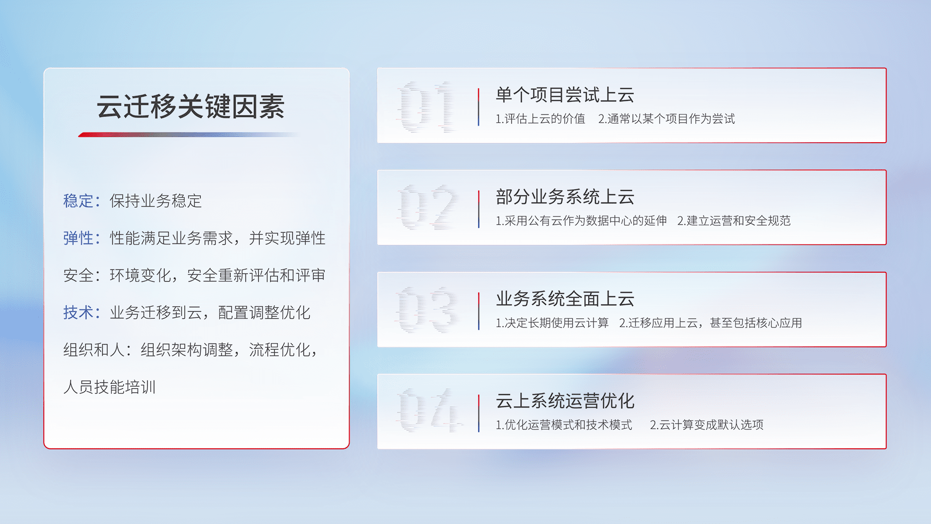 结合实际业务,,,从规划设计、、、、云平台选型、、、云原生改造、、、数据迁移、、集成交付,,迁移全过程为客户识别最佳上云路径,,,做好风险识别管理,,,设计网络架构、、身份权限、、、安全审计合规、、、、操作审计、、日志审计、、、监控告警策略、、多站点容灾设计等,,对云上基础设施进行整体规划,,,,提升IT治理水平,,以满足弹性、、高可用、、、、高性能的需求。。。。