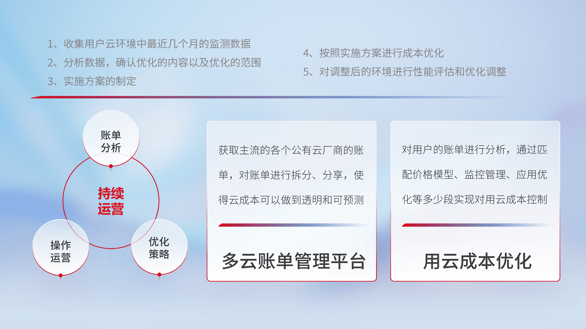 通过多云纳管,,,以统一的资源数据模型把客户的云资源进行抽象和封装,,,进而实现对多云资源的统一操作,,,保障云资源管理的可靠性、、、、稳定性与可用性。。。。量身定制化运维内容,,,,配置、、开发运维、、、、补丁管理、、、备份、、、监控、、、认证和访问管理、、、、审计和日常巡检等,,,保障在用云过程中的可靠度,,稳定度以及高可用率。。